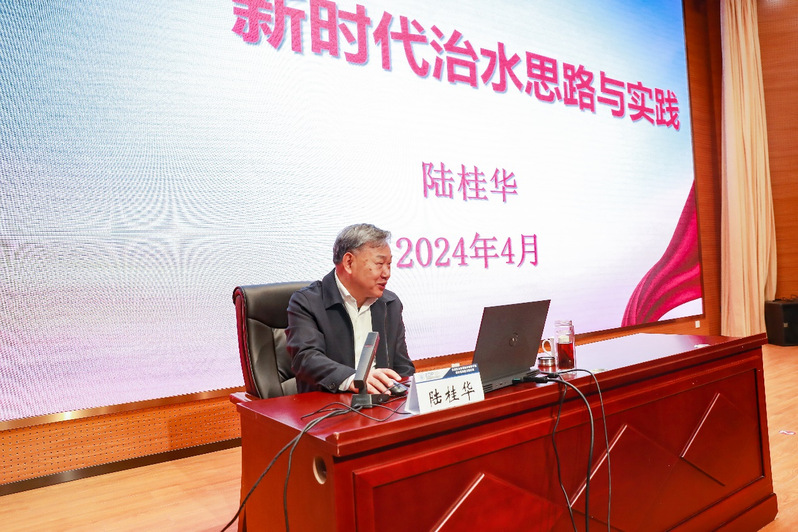 开班仪式结束后,第十四届全国政协常委、人口资源环境委员会副主任、民盟中央常委、水利部原副部长陆桂华教授为培训班讲授第一课《新时代治水思路与实践》。他结合工作和科研实际,讲述了中国水利概况、中国共产党在不同时期领导人民开展的治水实践及成就,重点从制度建设、工程建设、防洪减灾、水资源管理、河湖治理、生态保护、科技创新等方面讲述了新时代水利事业主要成就,提出了对新时代治水思路与实践的前瞻性、战略性、科学性思考。陆部长的报告兼具理论高度和思想深度,提升了参训学员投身水利事业的责任感和使命感。
