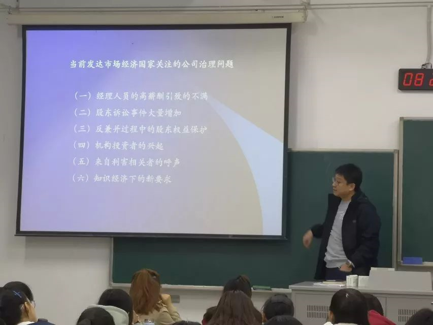其中,刘老师重点讲解了公司治理的问题与内容。在当前发达市场经济国家关注的公司治理问题中,刘老师分别举了赵薇投资事件与小区物业来解释股东诉讼事件大量增加和机构投资者的兴起这两个问题。刘老师也结合自身参观国家电网公司的经历,帮助同学们理解中国公司的治理问题。