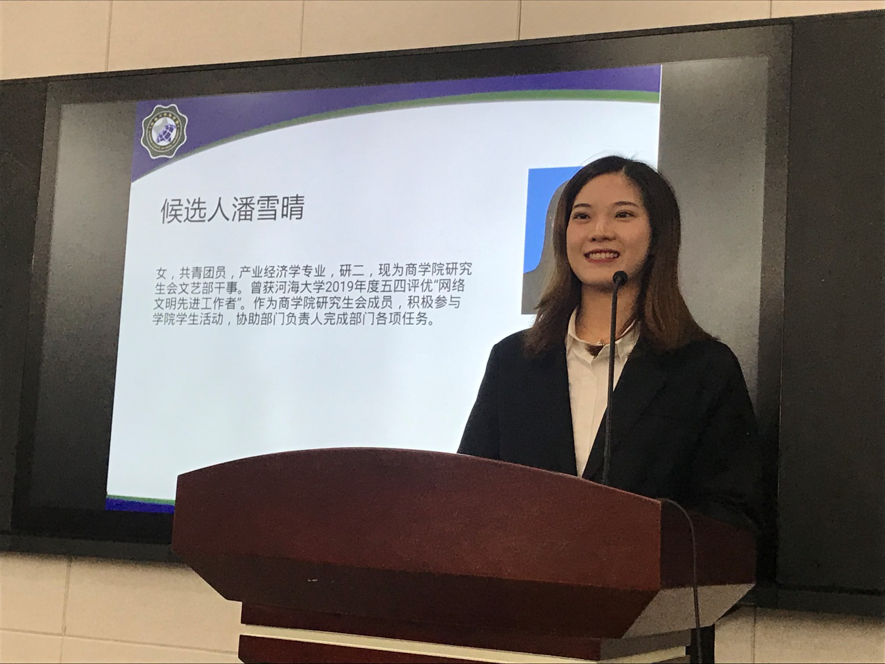 商学院团委书记陈璐老师代表学院领导对大会的召开表示热烈的祝贺,向学院广大研究生致以诚挚的问候。陈璐老师在讲话中充分肯定了学院研究生会过去一年做出的重要贡献和取得的显著成绩,并对学院研究生会的工作提出具体要求,寄予深切期望。她希望学院研究会继续以更高的标准严格要求自己,以服务广大研究生同学成长成才为主线,以锻炼自己为目标,勇于创新,积极地开展各项工作。