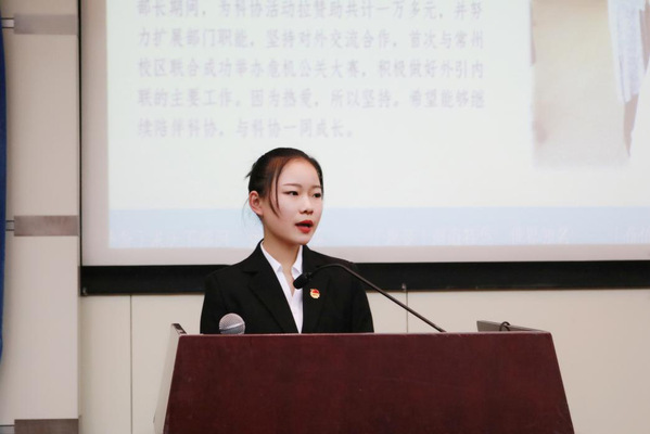 大二担任外联部部长以后,为加强校院间的合作学习,她带领部门首次与常州校区企管学院跨校区联合举办第六届危机公关大赛,并代表科协多方交流学习,举办讲座,为组织活动筹措赞助资金,获成人影院 学生组织“优秀部长”荣誉称号。任成人影院 学生科协副主席期间,她坚持制定严格的部门考核标准,细化部门职责范围,曾经组织危机公关大赛、模拟炒股大赛等多场比赛活动,活动参与量达到数百人,比赛范围涵盖多学院多校区,连续两次获得成人影院 学生科协“先进个人”荣誉称号。