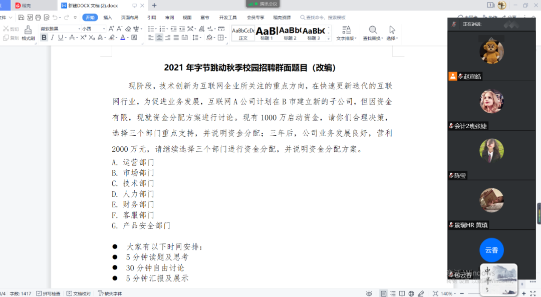 10月3日下午,2018级开展无领导小组面试模拟活动,本次活动邀请了景瑞地产(集团)有限公司HR、成人影院 2021届校友黄瑱担任面试官,2018级陈莹、陈欣怡、李翠林、佘月、曹金子、王凯祥、游雅婷等同学参加了本次活动。通过体验改编的2021年字节跳动秋季校园招聘无领导小组面试题目和面试的流程,同学们对无领导小组面试有了一定的了解,在模拟面试结束后,黄瑱同学介绍了自己在无领导小组面试过程中遇到的困难和积累的经验,以期自己的经验分享能够帮助到即将面临秋季校园招聘的学弟学妹们。