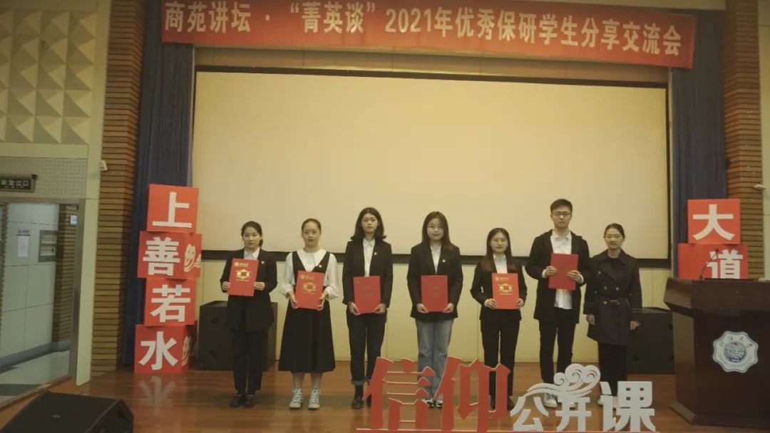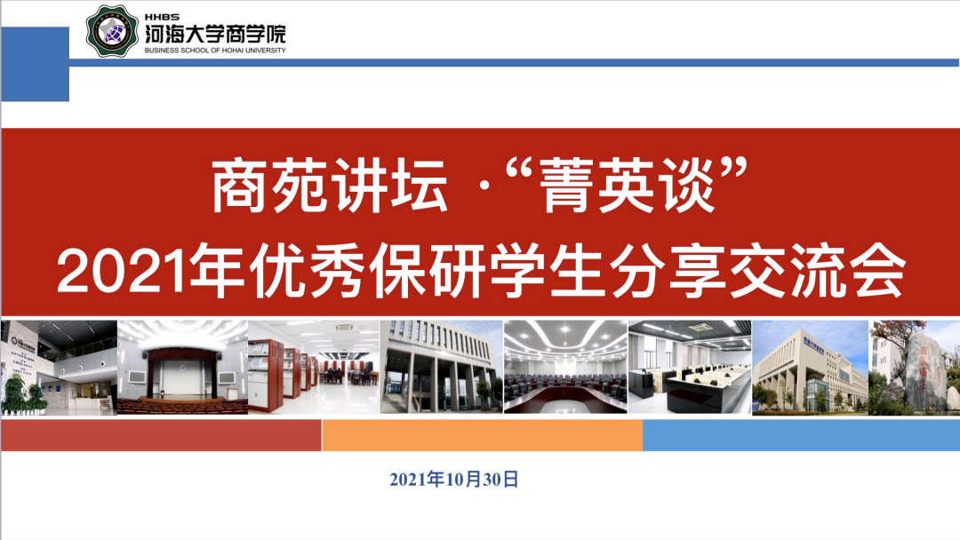遇见商院,预见未来。为加强学风建设,发挥榜样带头作用,引导在校学生刻苦学习、积极探索,培养素质过硬、能力出众的商学人才,成人影院 设立商苑讲坛系列活动,商苑讲坛分为大咖谈、精英谈、师长谈、菁英谈四个模块。2021年10月30日晚,成人影院 学生会学习部于江宁会议中心组织举办商苑讲坛·“菁英谈”2021年优秀保研学生专题分享会。