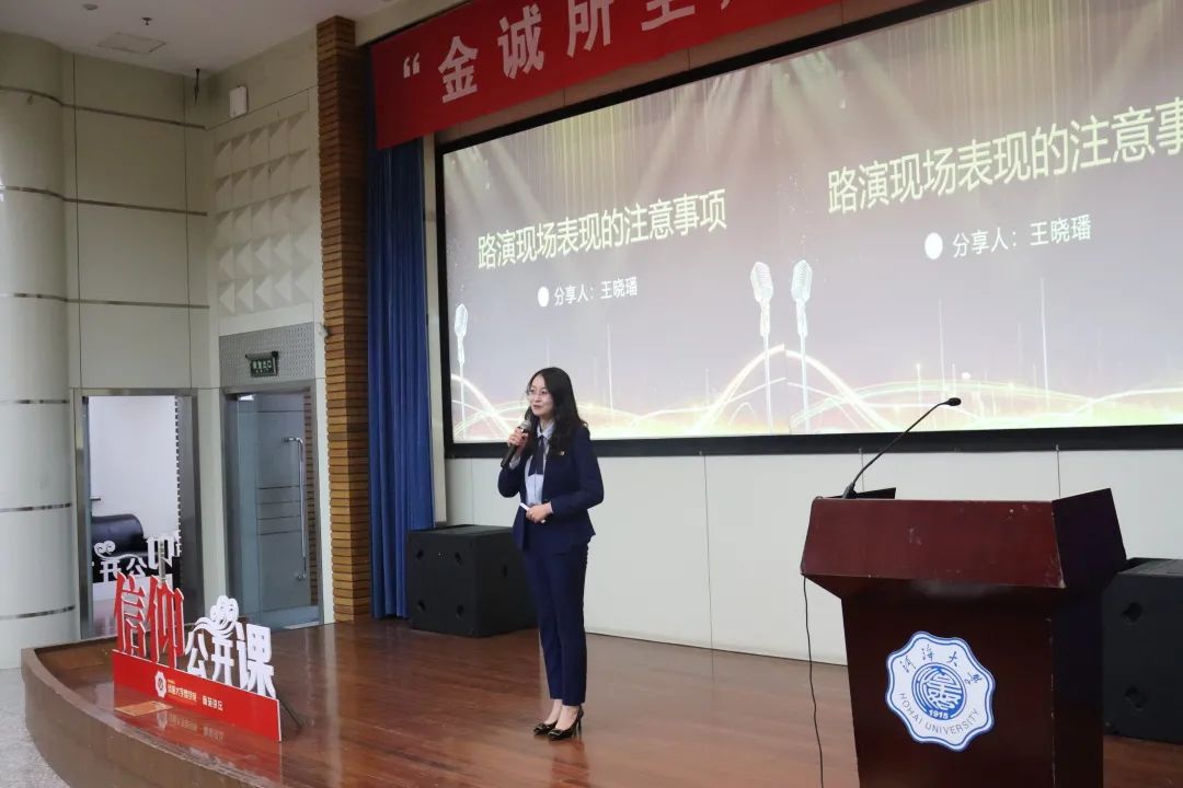启动仪式第三项,在各大创新创业赛事以及商赛中取得优异成绩的同学进行现场路演与经验分享。第一位为同学们分享经验的是成人影院 MBA学生王晓璠,她所在团队的项目——“蓝鲸号”水下机器人在MBA创业大赛中获得全国八强的好成绩。曾获“互联网+”全国银奖的李沁如同学也为同学们带来了一场精彩的现场路演,李沁如团队的项目——“崇新数字”同样致力于解决市场痛点,这样一款基于“区块链+AI智能合约”的数字文化产品交易分发一站式平台具有“用户上传即存证确权,维权更便捷智能,定价有参考”等技术亮点,现已获百万天使投资,并与20余家企业进行了合作。曾获“挑战杯”“互联网+”省赛二等奖的梁岚同学分享了她所在团队的项目,该项目深耕国家政策,关注民生福祉,致力于解决渔民的民生难题。在三位同学讲解完创新创业赛事后,杜佩恒同学为同学们分享了他对ERP沙盘大赛的想法。最后,李林同学为同学们带来了危机公关大赛的经验分享。