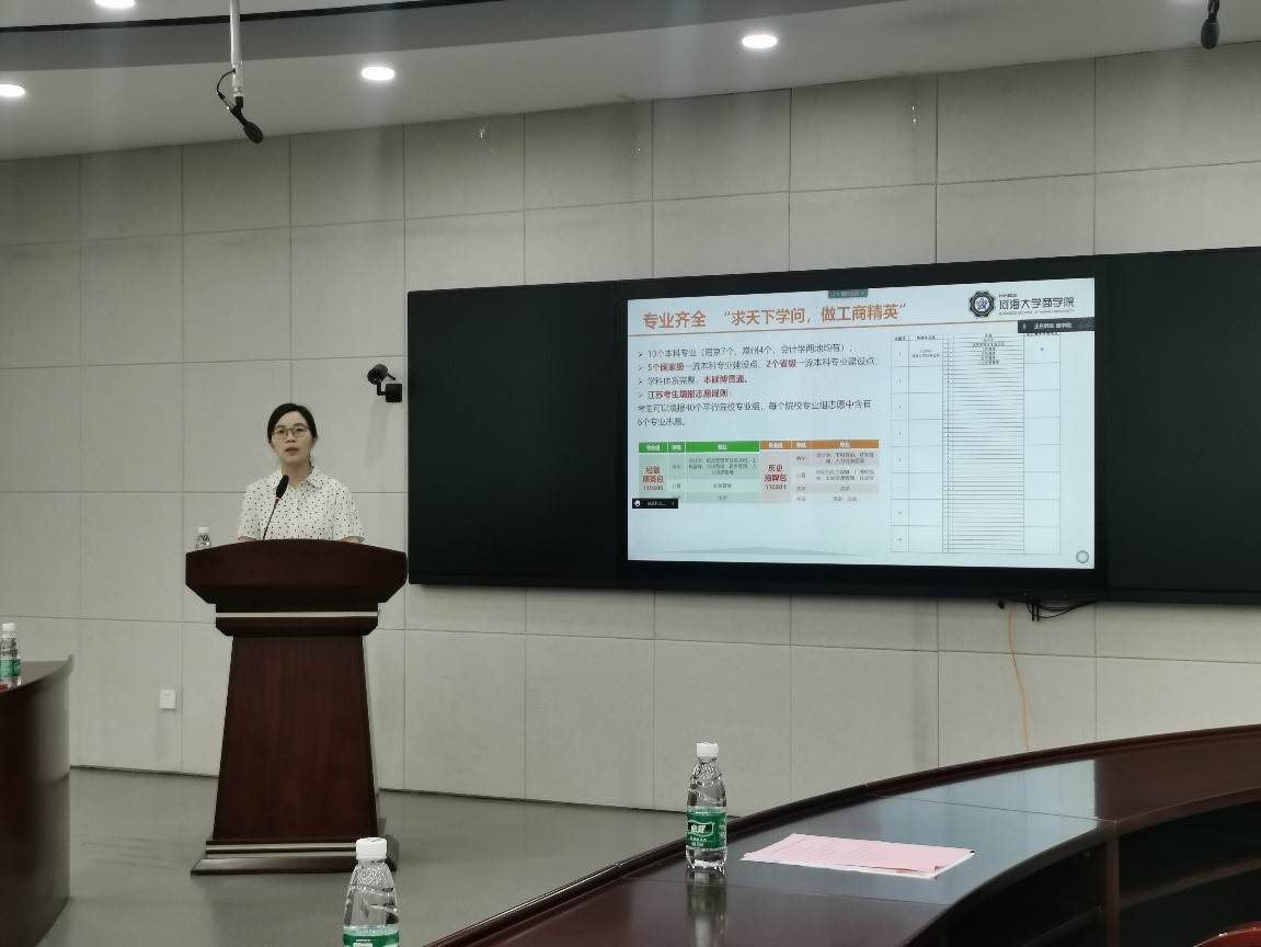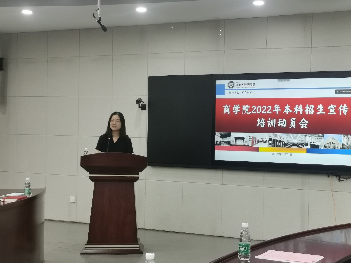 为做好2022年本科招生宣传工作,6月21日下午,学院在博学楼辅楼A100组织召开了2022年本科招生培训动员会,动员会邀请到成人影院 学生处、招办主任蓝崑副处长做培训动员,商学院党委吴宝海书记、学院其他领导班子成员,各系主任、各系党支部书记、各系今年参与实地招生的教师,以及全体辅导员参加,学院常州校区师生于线上参会,会议由学院党委戴媛媛副书记主持。