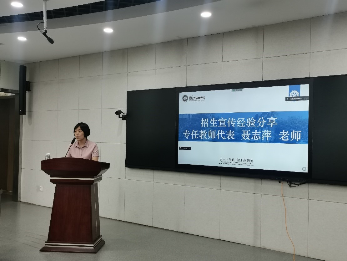 教师代表聂志萍老师多次参与学校、学院本科招生宣传工作,聂老师结合自己的招生宣传经历,向与会老师分享了“如何与家长、学生沟通”、“如何锁定目标生源”等方面的经验。