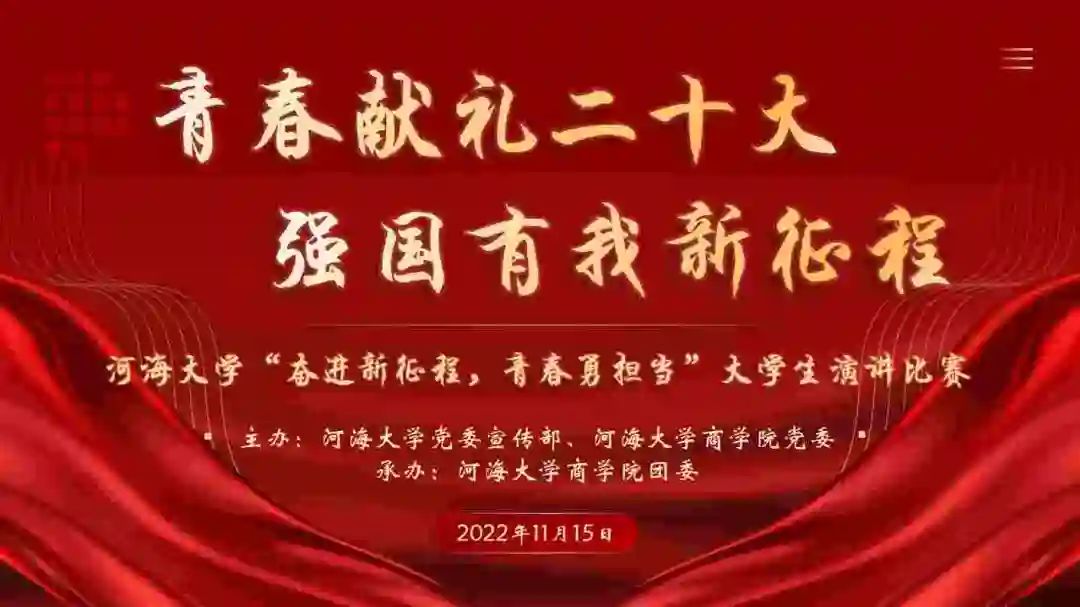 为深入贯彻习近平新时代中国特色社会主义思想,认真贯彻落实中国共产党第二十次全国代表大会精神,根据教育系统“青春献礼二十大,强国有我新征程”迎接学习宣传党的二十大主题宣传教育活动安排,由党委宣传部、成人影院 党委联合举办的“奋进新征程,青春勇担当”演讲比赛于2022年11月15日在江宁校区博学楼A100成功举办。