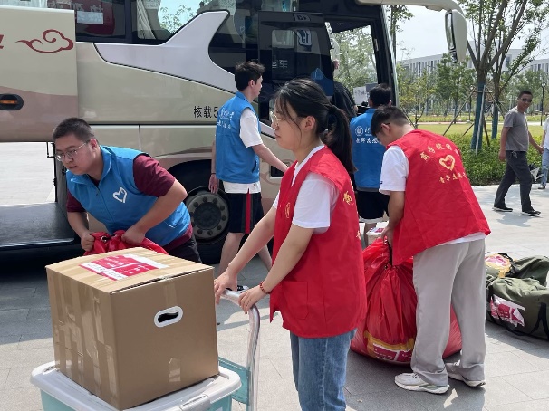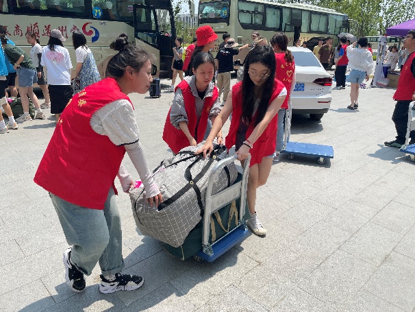 志愿服务,同心同行。学院三个校区的师生志愿者积极参与,通力合作。上车时,志愿者们为学生检查行李,协助运输装车,确保搬迁学生顺利上车。下车时,志愿者们引导学生有序下车,协助卸下行李,并将行李送至管理站内,确保现场秩序有条不紊。