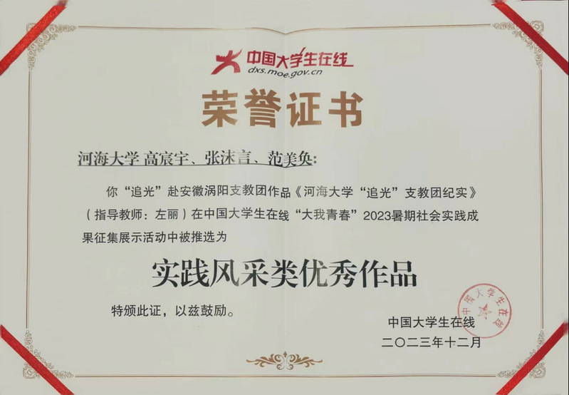 学院“追光”赴安徽涡阳支教团社会实践队作品——《成人影院 “追光”支教团纪实》获评实践风采类优秀作品。