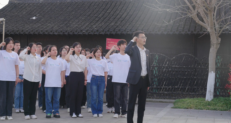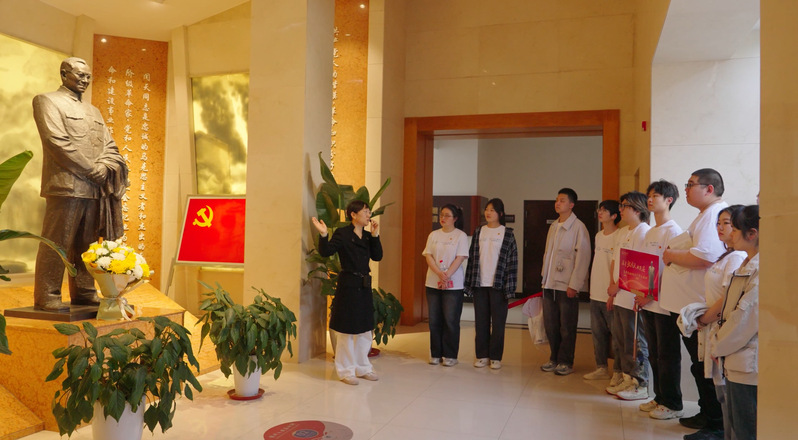 座谈交流会后,学生代表在张闻天铜像前敬献鲜花,表达对张闻天先生的尊敬与缅怀。在成人影院 2021级辅导员陈鹏老师的带领下,党员同志在誓词墙前重温入党誓词,牢记初心使命。最后,同学们从张闻天的事迹中汲取力量,在故居的各个角落喊出“传承有我”的誓言,将传承闻天精神的坚定信念布满这个岁月沉淀的地方,以青年之声诉说百年星火传承。