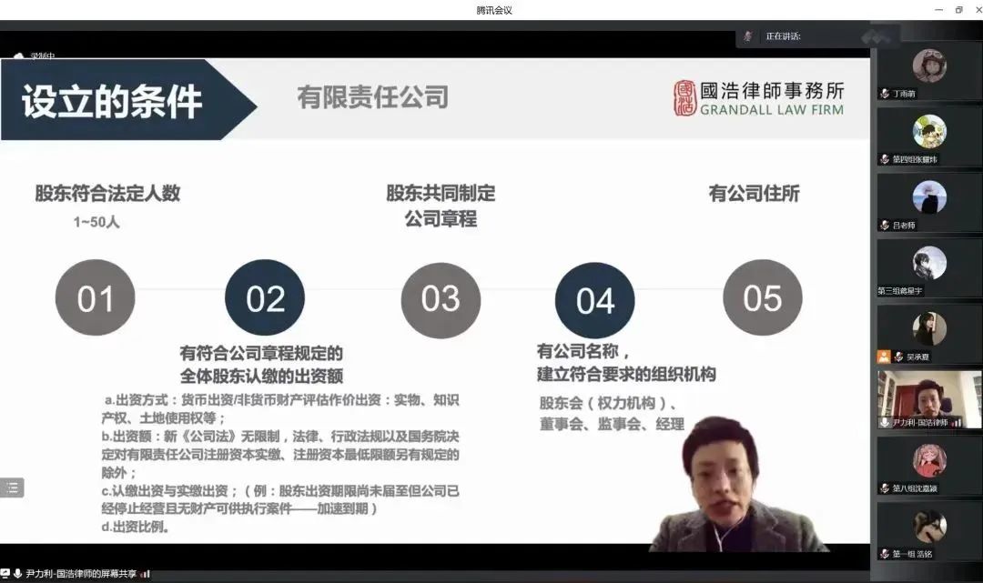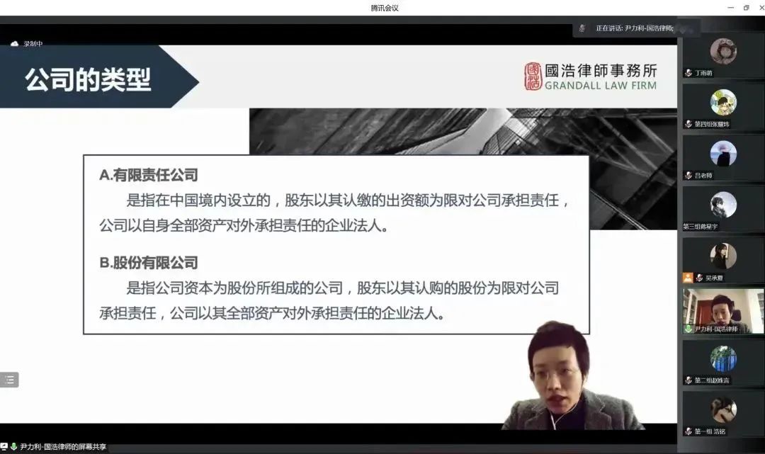 20221115日,第六期青创沙龙于线上成功开展。本次讲座邀请到南京国浩律师事务所的合伙人尹力利律师为创新创业训练营的营员们带来分享。