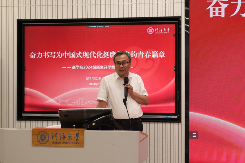 最后,学院党委陈杰书记为新生讲授开学第一课。陈书记从“守初心:凝心铸魂,夯实信仰根基”、“塑品行:河清海晏,赓续河海精神”和“启新程:扬帆起航,立志商学菁英”三个方面展开,层层递进,娓娓道来,鼓励同学们坚守初心、博学善思、锐意奋发、笃行致远,奋力书写为中国式现代化挺膺担当的青春篇章。