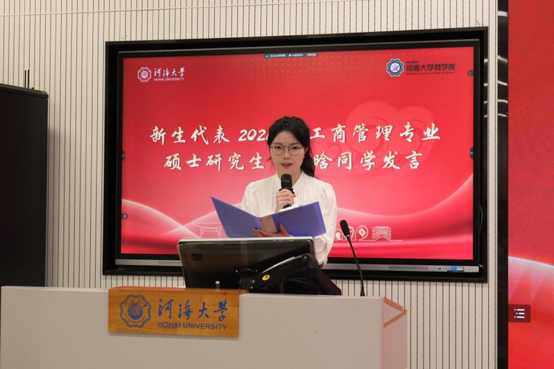 2024级工商管理专业硕士研究生曹露晗作为新生代表发言,向同学们分享自己作为支教团成员在中学担任政治老师的体会心得。她号召同学以躬身实践为基,以勇于担当为魂,以自律和勤奋创造自由与幸福,奏响新时代商科人才强音!