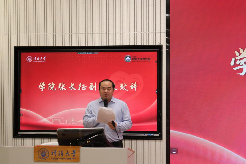 典礼在庄严的国歌声中拉开帷幕。副院长张长征教授进行开学典礼致辞,介绍了学院的办学宗旨、战略定位、师资力量和平台资源等方面情况。张院长指出,学院为同学们提供了一个“学科专业齐全强大”“规模庞大”的学习平台,也期望同学们能潜心问道、敢于创新;在做研究时体会苦中有乐、勇担重任;同时要自强自信、强健体魄,迎接未来的各种挑战,实现全面发展,不负光阴,成就卓越。