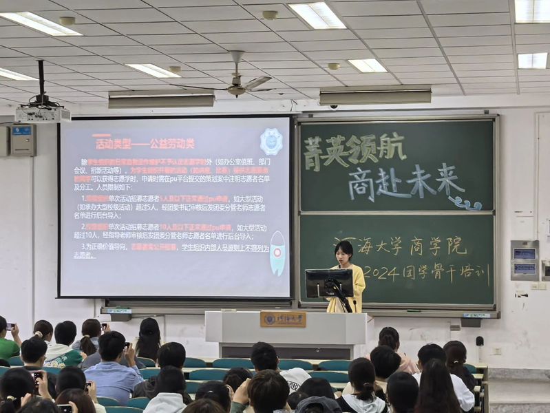 团委实践部主席陆灿然同学针对第二课堂实践活动进行讲解,对管理人员进行操作培训。