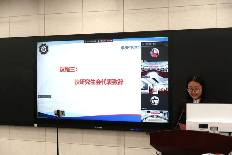 校研究生会代表田梦婷同学对大会的召开表示了热烈祝贺,充分肯定了成人影院 研究生会过去一年所取得的成绩,并对研究生会未来工作提出了期望。