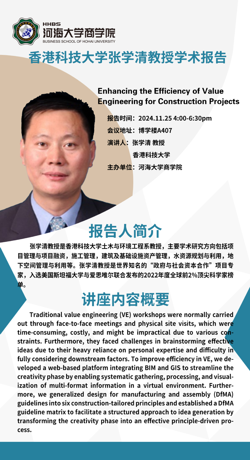 学术讲座通知:Enhancing the Efficiency of Value Engineering for Construction Projects