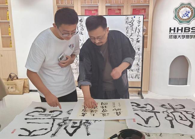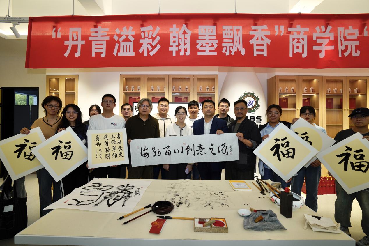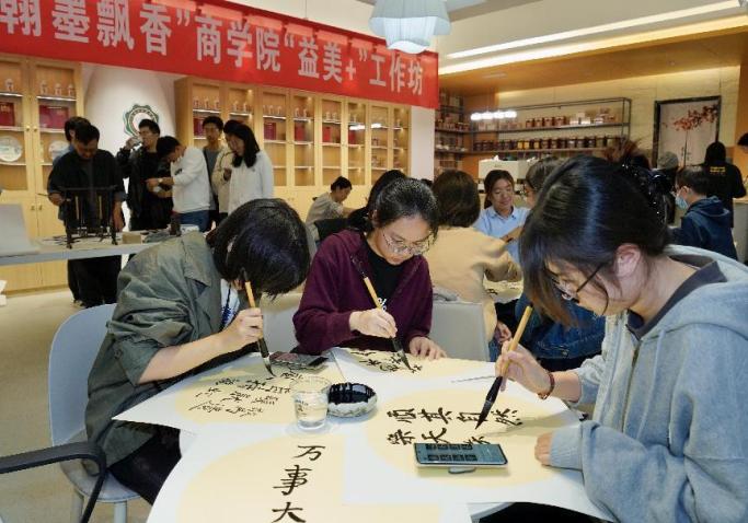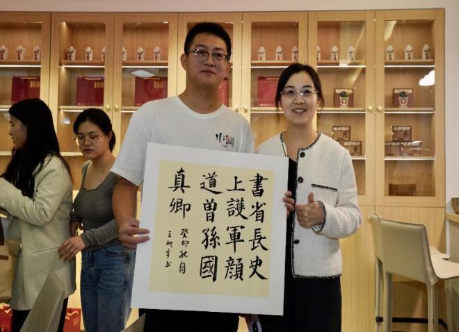 活动开始,杨六平、田延风与学生一起参加了“丹青溢彩 翰墨飘香”成人影院 “益美+”工作坊举办的书法辅导交流活动。活动中,田延风现场创作,一幅幅遒劲有力、气韵生动的书法作品,让在场师生感受到了书法艺术的独特魅力。杨六平从专业的角度对现场学生作品做了点评,同学们兴致高昂,积极参与,完成创作后相互鉴赏交流,最后大家拿着作品与专家合影留念。