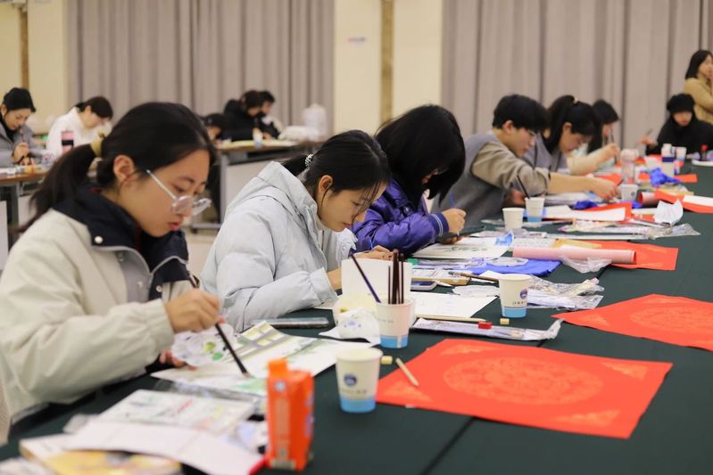 在参观学习的路上,同学们时时拿出手机拍下水利枢纽的壮观场景,为下午的书画活动做好准备。活动开始时,江都水利枢纽王雪芳主任向所有嘉宾和师生的到来表示欢迎,并向大家详细介绍了江都水利工程管理处的发展历程,希望成人影院 的同学们以水为媒,讲好水故事,传承水文化。接下来,蒋义海老师和刘宪老师向同学们传授水彩画技巧与水利景观的绘画表现方法,并现场进行作画示范;蒋义海老师讲解了书画创作经验与理念,现场进行书法创作。研学团的师生用颜料描绘江都风光、展现水利之美,用喜庆的福字、对联迎接新年,表达对未来的美好祝愿。