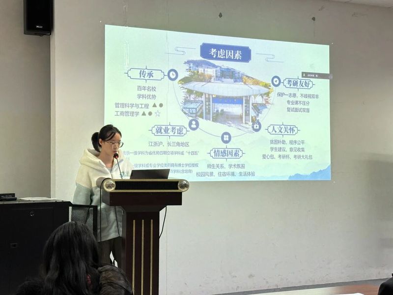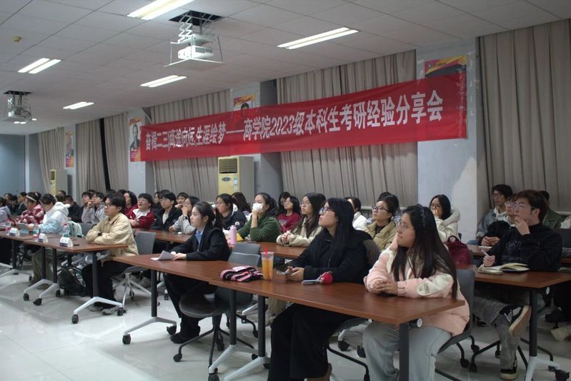 为进一步落实立德树人根本任务,发挥朋辈帮扶和引领作用,助力学生明晰未来生涯方向,科学规划升学深造,成人影院 2023级本科生分别于12月10日、12月18日在博学楼辅楼A103、A104开展“商途向远,生涯绘梦”升学经验分享会。两场经验分享会邀请到了李梅秀、林佳欣、邱菁秀、浩铭、于博雅、卢玥、雷舒7位2021、2022级考研、推免成功的同学和2021届毕业生叶勇同学进行分享。活动由2023级本科生辅导员周子芮老师主持。