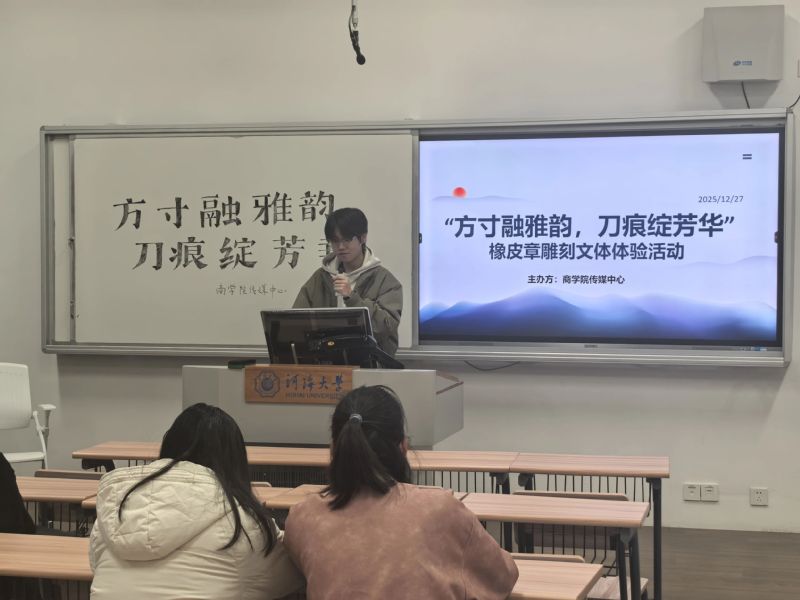 活动开始,传媒中心的工作人员先对传统雕刻艺术和现代的橡皮章雕刻艺术进行系统的讲解。同学们逐步了解了中国传统雕刻艺术和西方橡皮图章起源,各种类型的现代橡皮章雕刻让同学们更清晰地感受到雕刻之美,传媒中心的工作人员总结本次活动的价值与现状,让助力文化传承发展的种子在同学们心中生根发芽。