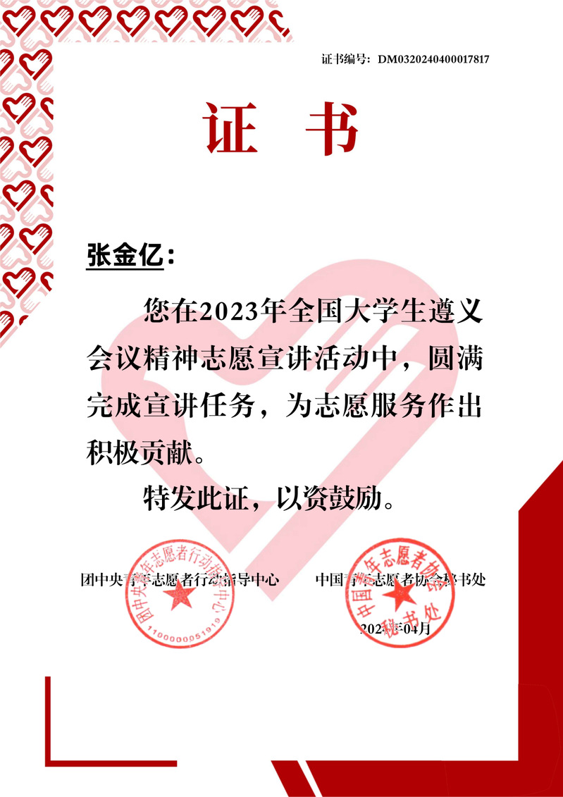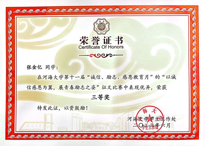 张金亿来自于农村困难家庭,她在国家、社会与学校的爱心与关怀下一路成长,是国家的资助育人政策助力她从义务教育阶段一路走到大学校园,感恩的种子早早在她心中播种。进入大学之后,她先后成为学校“青马工程”学员、“1442工程”学员、院学生会主席、年级团总支辅导员助理、学生工作处助管等,拥有校、院多级平台的“n”重身份,在丰富、扎实的学生工作中汲取养分,向上生长,并立志回馈。她不断了解多重资助政策,参与学校“以诚信感恩为翼,展青春励志之姿”征文比赛,真诚发表自己关于资助政策与成长之路的感想。同时,她也积极参与红色精神相关活动,加入团中央全国大学生遵义会议精神志愿宣讲团队、跟随学院红色水利团队开展调研,深入一线了解基层政策,不断沉淀自己的“红”色感恩心,也在心底深深扎下自己的“助梦根”。